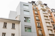Die schützende, glatte, feine Außenhaut mit neutraler Farbe blickt zur Stadt hin. Zur Rue de Charenton wählten wir aufgrund der Gestalt der Parzelle Volumen mit überraschenden Proportionen, die sich zum Dach falten, wobei Dach und Fassade einheitlich mit dem gleichen Material verkleidet sind.